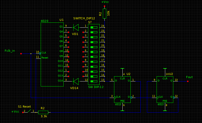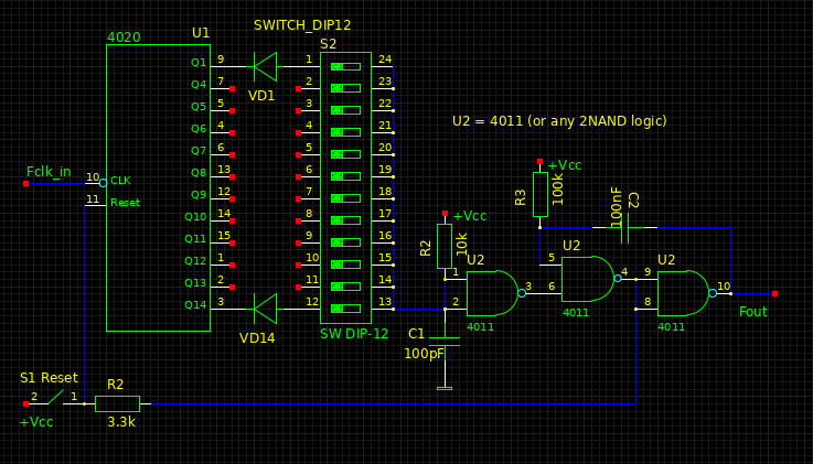 да. прямо на соединение дип свичей (низ R1) его и вуаля. но одновибратор в цепочке ресета - обязательно, иначе сброс счетчика будет ненадежным , возможно даже неполным. (100pF завалит фронт там до неприемлемого уровня для прямой подачи на R)