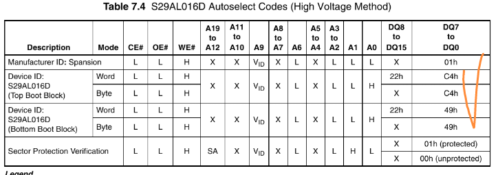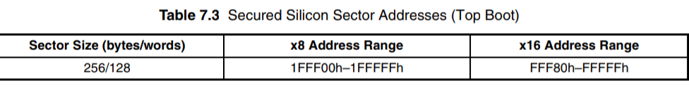 Это для top boot, судя по id. Адреса secsi для s29al016j(m) будут у верхней границы памяти 1FFF00h–1FFFFFh(x8). Название МСХ заканчивается на 01, r1. Для bottom boot id будет равен 0x10004922, и адрес secsi начинается с нуля: 000000h–0000FFh(x8). А название микросхемы для bottom boot будет заканчиваться на 02, r2.