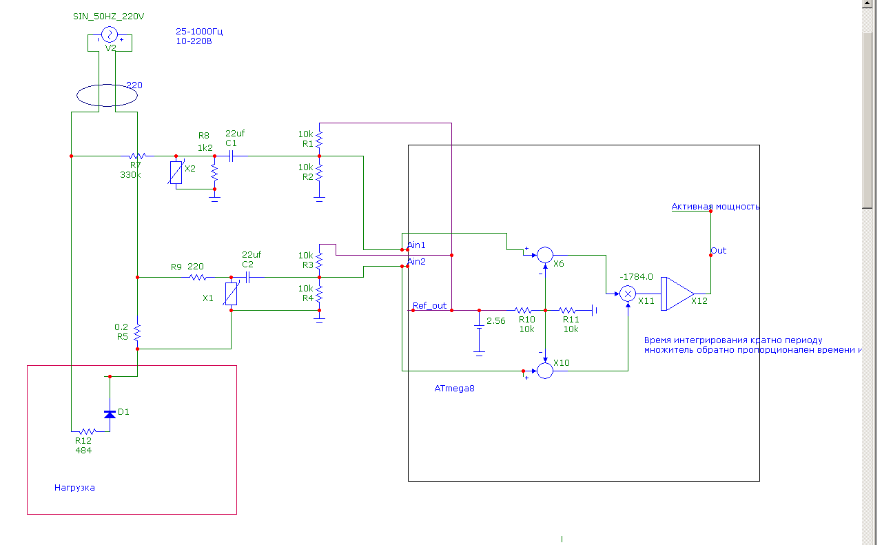 вот тут я схематично ваттметр нарисовал download/file.php?id=32271 .т е нужно упростить 1 РЕФЕРЕНС -2.56в 2 делитель референса пополам - и на вход ацп 3 через конденсатор заводим переменнку с сетевого делителя (трансформатора) делитель должен быть в 310 раз что бы получить амплитудные значения 1.25+1 и 1ю25-1 дале записываем нное количесвто выборок важно чтобы время записи было равно или кратно периоду сетевого напряжения например имеем 100выборок с шагом 1миллисекунду( что Элементарно делается) сначала вычисляем среднее (оно в принципе известно но НАДО считать) ss1=0 for (i=0;i<99;i++) { SS1=SS1+sampl_u[i] } AVG=SS1/100далее вычисляем действующее значение SS2=0 for (i=0;i<99;i++) { SS2=SS2+(sampl_u[i]-avg)*(sampl_u[i]-avg) } AVGRMS=sqrt (SS2/100) *310(вх делитель)* 2.56/1024(цена разряда в вольтах)