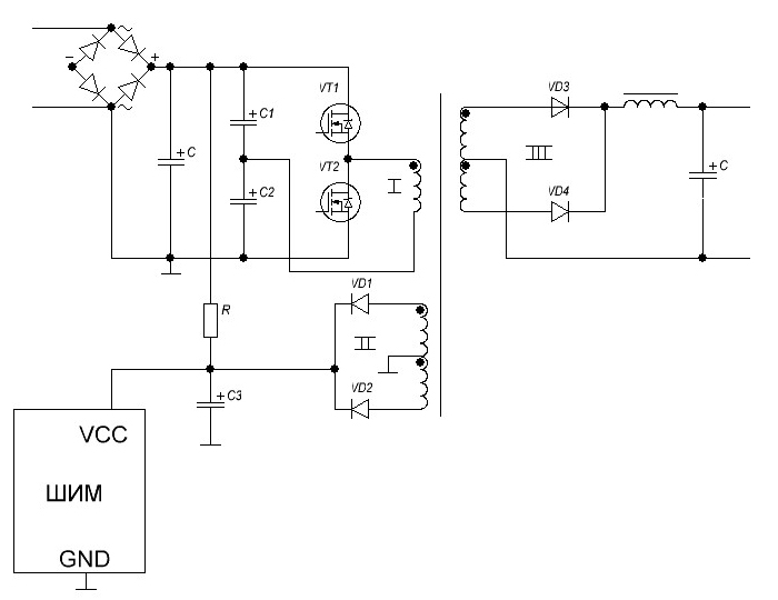 Здравствуйте уважаемые коты. Думаю, что вам уже надоело разжевывать подобные темы, а если нет, буду вам признателен в разъяснении моих сомнений. Поправьте меня, пожалуйста, если я не прав. Итак. В первом такте работы схемы происходит следующее. Открывается транзистор VT, а VT2 закрыт. Тогда ток протекает от плюса выпрямителя через VT1, через первичную обмотку тр-ра в направлении Н-К обмотки, далее через конденсатор C2 и на минус выпрямителя. В обмотке номер 2 ток начнет протекать от Н обмотки через диод VD1 и на конденсатор C3 и на запитку контроллера. И после вернется в среднюю точку обмотки 2, которая соединена с минусом выпрямителя. В обмотке 3 ток потечет от Н обмотки, через диод VD 3 на дроссель и далее в схему , а с нее вернется в среднюю точку обмотки 3. Естественно, что вторые половины обмоток 2 и 3 не будут задействованы в это время из за диодов VD2 и VD4 соответственно. Далее. Когда начнется второй такт работы и транзистор VT1 закроется, а VT2 откроется, ток потечет в схеме от выпрямителя, через конденсатор C2, через обмотку 1 от К-Н и через VT2 к минусу выпрямителя. В обмотке номер 2 ток потечет от К обмотки, через VD2 на конденсатор C3 и на зпитку контроллера. И после вернется в среднюю точку обмотки 2, которая соединена с минусом выпрямителя. В обмотке 3 ток потечет от К обмотки, через диод VD 4 на дроссель и далее в схему , а с нее вернется в среднюю точку обмотки 3. Простите что так муторно и подробно, нигде вроде не ошибся? Далее, Левая часть схемы никак не сообщается с правой частью схемы. Вопрос! Повлияет ли на правильную работу схемы в общем если вторую и третью обмотки намотать в противоположном направлении относительно первичной обмотки? Сразу оговорюсь, что в обмотках 2 и 3 их средний вывод соединяет в себе начало и конец половинок своих обмоток. Здесь все согласно точкам на схеме. Тупо меняем направление намотки вторичек относительно первички. Я думаю ,что на работу устройства такая намотка в данной схеме не повлияет кроме того ,что в первом такте во вторичках ток побежит через VD2 и VD4. А во втором через VD1 и VD3. Поправьте если я не прав пожалуйста. Хочу понять для себя именно для этой схемы.