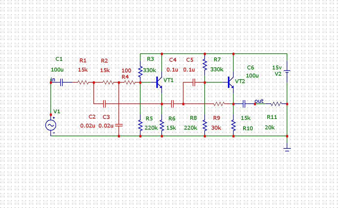 А попонятнее можно? Полоса пропускания какая ?Вот окончательная схема фильтра на транзисторах,файл микрокапа ,остальное(частоты среза) сами легко подстроите.Детали ФНЧ и ФВЧ выделил красным цветом ,за основу самого повторителя взял рокотфильтр Веги106.ОФФ. Самый первый ФВЧ ,который я закачивал несколькими постами выше тоже рабочий ,только смещение питания транзистора там простейшее.