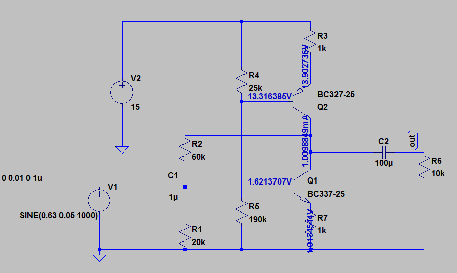 Мы управляем только Q1, который полностью открываясь, разряжает конденсатор C2 на на нагрузку R6, и наоборот закрываясь или находясь в рабочем режиме (при отсутствии сигнала в момент первого включения) конденсатор С2 вновь заряжается от Q2, плавно опускает свое напряжение на на нагрузку R6, только уже другой полярности. Схема представляет собой классический усилитель на одном транзисторе, с общим эмиттером и отрицательно обратной связью по току.