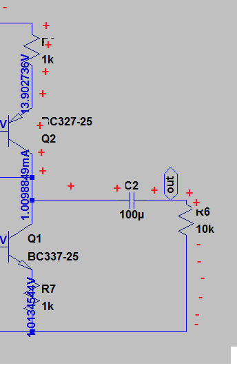 При отрицательной полуволне или отрицательного потенциала на базе транзистора Q1, Q1 закрывается полностью, переход база - эмиттер Q1 закрыт, конденсатор вновь заряжается по пути (+) -> R3 -> Q2-Э-К -> C2 -> R6 -> (-) Потенциалы на резисторе R6: