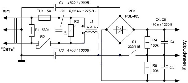 Диоды выпрямительного моста VD1 от броска тока при первоначальном заряде конденсаторов фильтра С4/С5 защищены терморезистором R2. Терморезистор R2 с отрицательным температурным коэффициентом ограничивает амплитуду броска тока зарядки конденсаторов С4, С5 в момент включения блока. Затем в результате саморазогрева его сопротивление падает, и он практически не влияет на работу выпрямителя. Варистор R3 с классификационным напряжением больше максимальной амплитуды сетевого напряжения защищает от выбросов напряжения. Сопротивление варистора очень велико и достигает десятков мегом. Но при достижении напряжения между выводами варистора определенного значения (как правило, около 470 вольт) сопротивление скачкообразно падает до незначительных величин (единицы ом), тем самым пропуская высоковольтные всплески через себя, и защищая БП от их негативного воздействия.