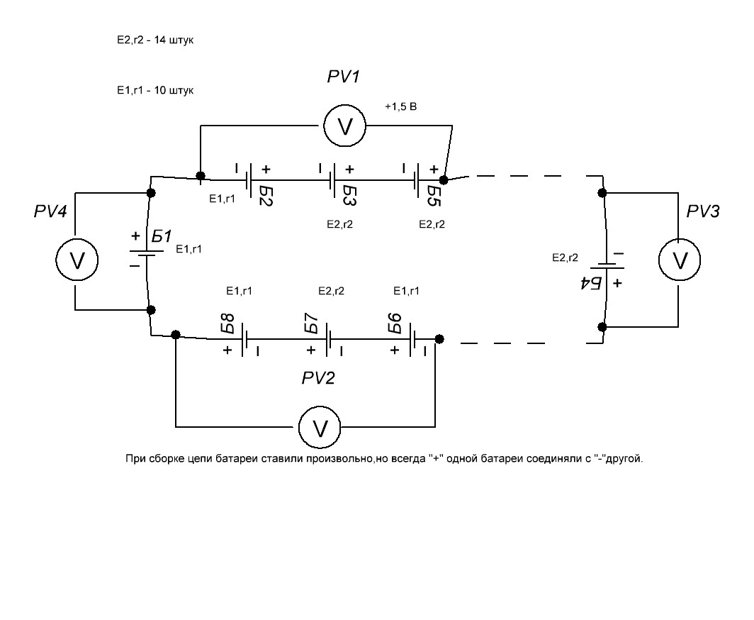 Приветствую. Если можно,прошу подсказать. Имеется задачка школьная с данными: Источников питания Е1 - 10 шт,Е2 - 14 штук,напряжение на V1 - 1.5 В Определить ,что покажут с учётом знака остальные вольтметры.