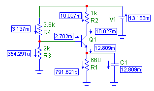 Таким образом, ток базы = (ЭДС V1 - Uбэ) / Rвнутр_v1