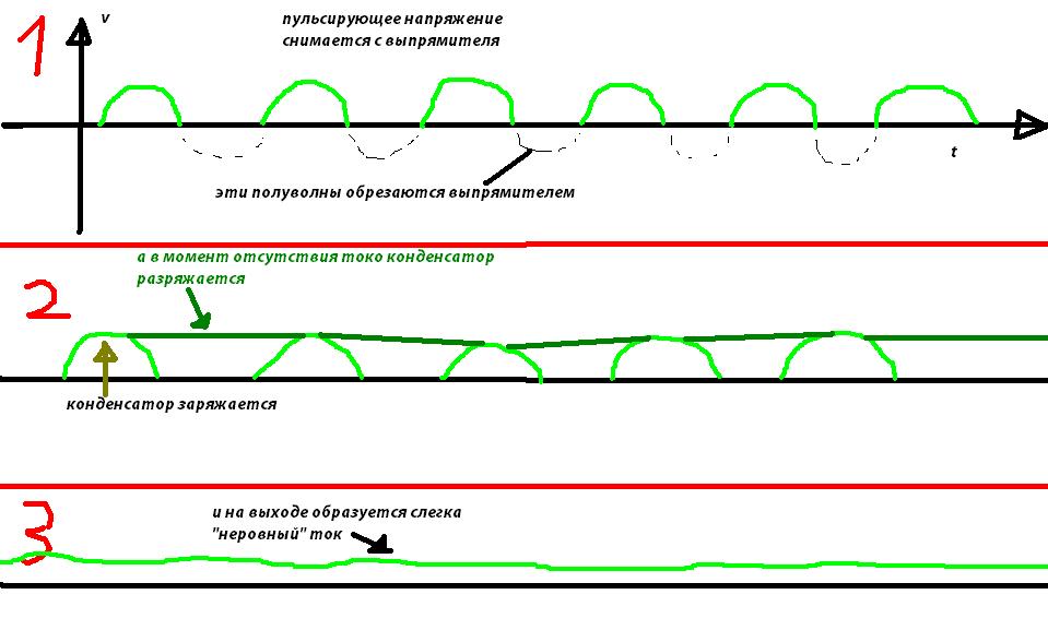 поэтому считайте что у вас цепи не идеальный_источник_напряжения->конденсатор_на_землю->нагрузка (в этом случае конденсатор никак не влияет на схему), а идеальный_источник_напряжения+переменные_помехи->резистор->индуктивность->конденсатор_на_землю->переменная_нагрузка. вот если вы рассмотрите эту вторую схему, то увидите как влияет емкость на форму сигнала. L-R-[C и Rнагрузки впаралель на землю] делитель, вся переменка осядет на L-R, а постоянка на C||Rнагрузки.