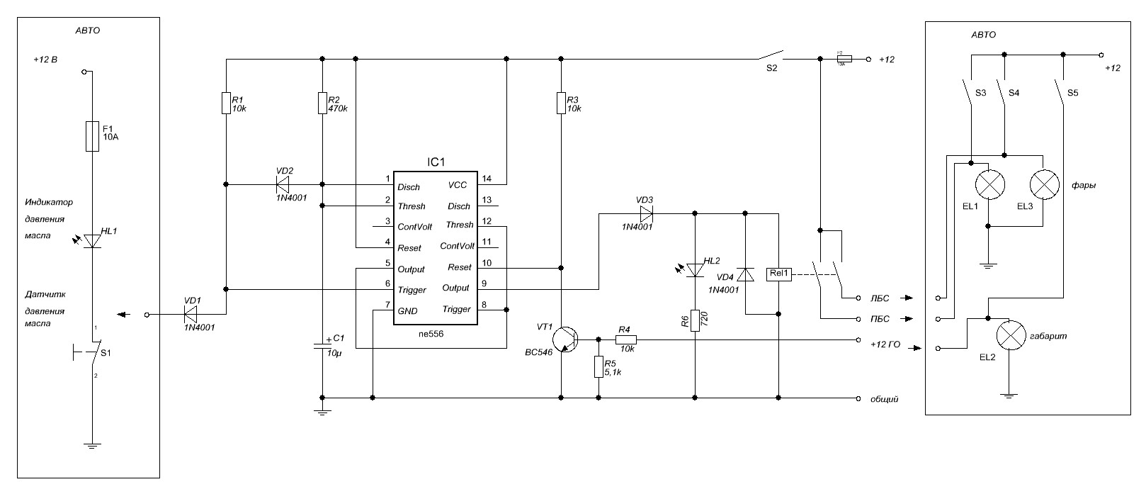 Всем доброго времени суток. В общем вот понапридумывал тут автомат включения света фар.... берем сигнал от датчика давления масла, делаем задержку в 5-10 сек. на 555, на втором 555 (чтоб была одна микросхема) реализуем схему выключения фар при включении габаритных огней (для перевода авто в режим управления светом от штатных переключателей). Возникло пару вопросов 1 как подобрать VD1-3 (например типа кд 522 если не ошибаюсь? или есть нюансы) 2 как подобрать VT1 (исходя из каких соображений), надо ли его базовую цепь предохранять, например от скачков напряжения в автомобиле? или защищать цепь автомобиля на случай его выхода из строя?) 3 как рассчитать параметры R3 и 5 4 правильно ли включил HL2 (индикатор работы ближнего света от этого устройства)? 5 сопротивление обмотки реле около 350 Ом, т.е. потребляет около 50 мА, можно его включить без транзистора? (с учетом опять таки особенностей бортовой сети автомобиля), 555 вроде дает выходной ток до 200 мА. 6 возможно уже просто туплю, но можно как нибудь иначе (с минимальным числом деталей) реализовать в устройстве функцию отключения ближнего света при включении габаритов (схема на транзисторе не внушает надежности)?