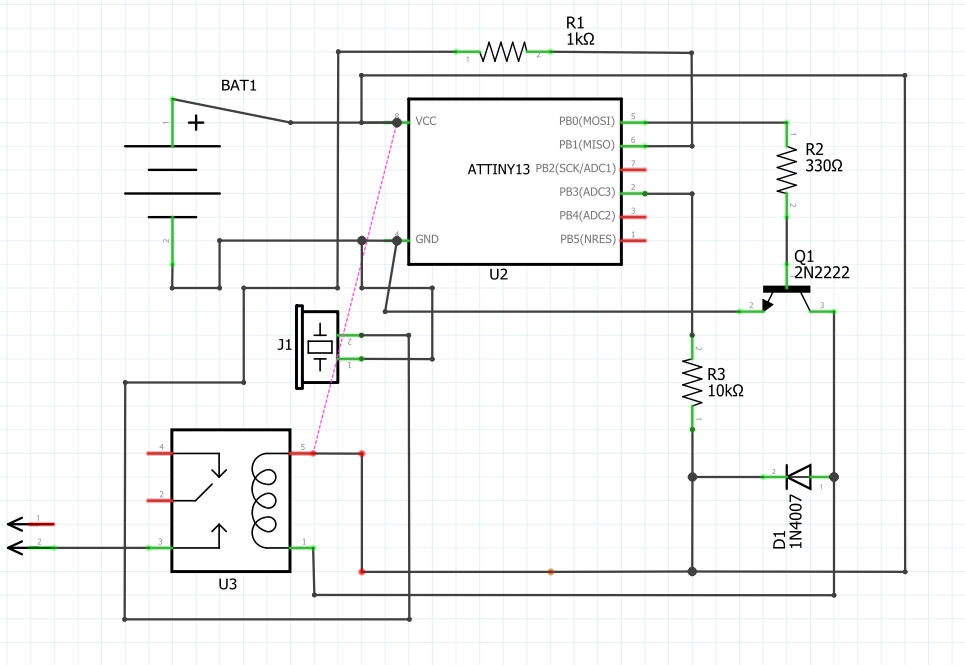 Суть схемы - при подаче питания Attiny13 на ногу PB0 дает 5 вольт, дальше по идее транзистор должен открыться и включить реле. Спустя определенное время микросхема убирает 5 вольт, реле отключается. Реле SLC-05VDC-SL-A. Проблема в том, что при подаче питания на схему хоть с вставленной Attiny, хоть с вытащенной - включается реле. Никак не могу понять почему. Измерил напряжение на базе после подаче питания (хоть с микросхемой, хоть без нее - 0.04 В). Пробовал поставить подтяжку в 10-20 кОм к земле на базу - не помогает, все равно реле включается и висит так, пока питание не отключишь. Диод тут по схеме должен гасить ЭДС от реле. Подскажите, пожалуйста, что тут не так? Вроде схема простейшая, но где-то я накосячил...