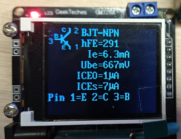 А вот это может быть похоже на правду. Прибор (на картинке выше) выдал распиновку - 1 - эмиттер, 2 - коллектор, 3 - база. В прибор вставлялось слева направо номера ног - 1, 2, 3. В даташите же написано, что 1 - эмиттер, 2 - база, 3 - коллектор. Сейчас попробую поменять ноги на плате