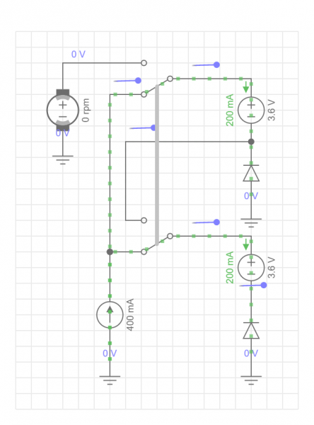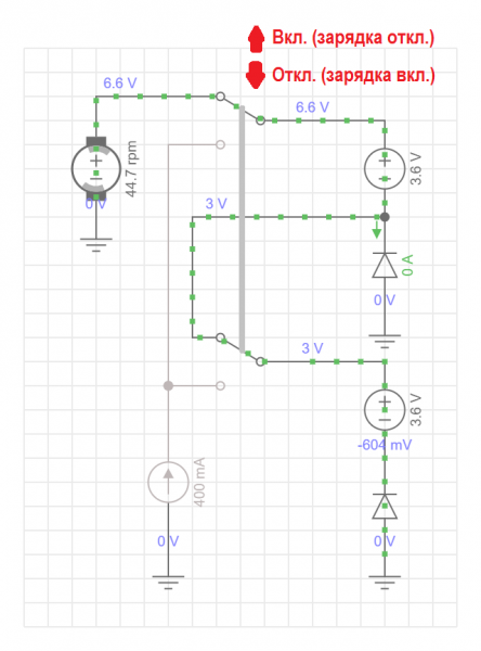 Если кому интересно, могу привести свой вариант схемы, свободный от ВСЕХ вышеперечисленных недостатков. К сожалению, коммутация всего лишь на двух переключателях в данном случае невозможна, поэтому схема усложняется на два диода. Они используются не только для коммутации, но и для балансировки токов между параллельно включенными аккумуляторами. На схеме нагрузка условно обозначена в виде коллекторного мотора, а контроллер зарядки в виде генератора тока. Диоды должны быть одинаковые. Так как через нижний по схеме диод течёт ток нагрузки, диоды должны его выдерживать. Для снижения потерь предпочтительно использовать диодную сборку с общим анодом и барьером Шоттки. Если это невозможно, необходимо перенести нижний по схеме диод в разрыв проводника между переключателем и контроллером зарядки. На контроллере зарядки нужно скомпенсировать наличие диодов подбором резистрного делителя, установленного по входу обратной связи.