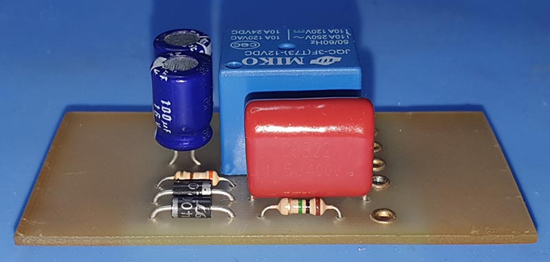 Реле применено на 12 вольт, с сопротивлением обмотки 385 Ом. Гасящий конденсатор стоит 1,1 мкФ на 400 вольт. При этом напряжение на реле составляет ровно 12 вольт (при 220 вольт переменки на входе). Номинал 1,1 мкФ не очень ходовой, в моих запасах нашелся только один (маркировка СВВ22 115J400V). Если такой найти не удастся, его можно заменить двумя конденсаторами более ходовых номиналов 1мкФ и 0,1 мкФ, включенными параллельно. При использовании реле других типов (другое напряжение питания или другое сопротивление обмотки) номиналы конденсаторов С1...С3 придется подобрать самостоятельно.