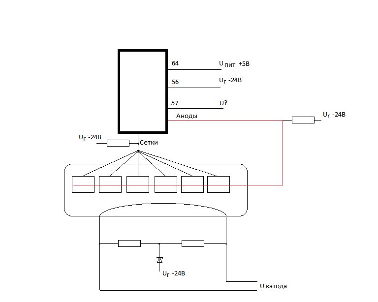 Такого в принципе быть не может, т.к. выв.56 подключен к самому отрицательному потенциалу в схеме. Если только он не подключен, а подтяжка анодов/сеток к -24В. осуществлена внешними резисторами, но мне отсюда этого не видно.