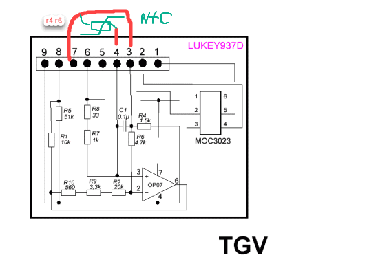 Так схема же есть, по схеме и разбираться. ищите дорогу от температурного датчика на операционник, у вас по ходу впаяны постоянные резисторы, обвязка операционника стандартная, всё на плате с маркировкой Lukey 937d