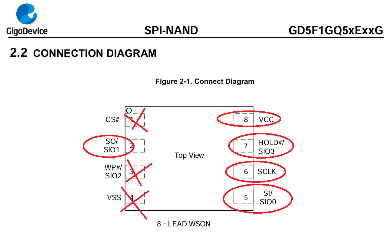 Есть бОльшая неприятность - GD5F1GQ5REYIG на 1.8В. Что будет с ней, когда ее пнут в 3.3В ... Что до самих ног, то не хватает двух - земли и CS. И тут надо прозвонить железное брюхо, оно вполне может оказаться землей. А с CS - уже проще. Собирается в считывателе (с питанием 1.8В) в режиме SPI, а потом мокрым пальцем прижимается к стороне с CS, авось уйдет в 0. Вообще, даже не подключенный вывод наверняка в 0. Т.е. попробовать можно, если на брюхе земля и найдете считыватель с режимом SPI (думаю все умеют) и питанием 1.8В (а вот тут ...