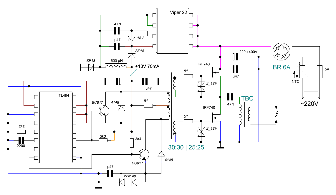 Просьба к тем, кто собрал данный догчейзер и доволен полученным результатом. Если есть возможность замерьте размах напряжения по предложенной схеме. Интересует величина Vpp на осцилографе и какая частота (интересно сравнить со своими результатами).