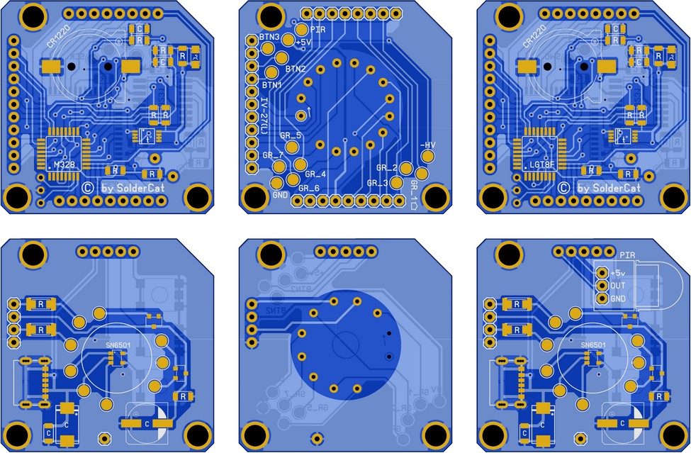 Платы под ИВ-27М для этих часов в первом приближении получились такие (сделал по аналогии со своими платами для ИВ-18, размер оставил тот же)... Из изменений: - применен датчик температуры DS18B20U (тот же DS18B20, но в SMD); - вместо фоторезистора поставил SMD фототранзистор (PT1206); - добавил дорожку под датчик движения, но это пока в пустоту, на поработать, подумать... По идее это не должно влиять на работу часов без изменения прошивки... остальное по схеме оставлено как есть... Скомпановано таким образом, чтобы минимизировать количество проводов через трубки... Количество трубок оставил три, трубки заложил внешним диаметром 4мм... Крайние платы можно снимать полностью... Ошибок на платах пока не нашел, но поищу... если кто-то захочет поискать, только скажу спасибо...