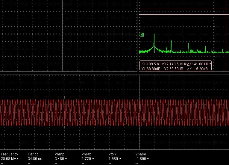 Здесь 1-я гармоника 4,8 дБ 2-я -16 дБ 3-я - 20.8 дБ 4-я -31.2 дБ (Полоса осциллографа 100МГц, так что о 4-й можно только гадать)