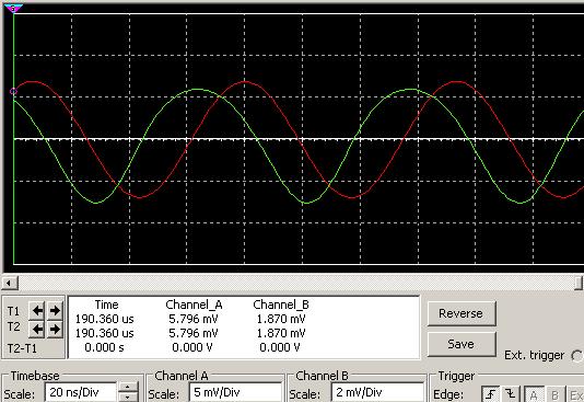 Красный синус - на нижнем конденсаторе контура (С2) Зеленый - на резисторе 1Ом в цепи эмиттераю