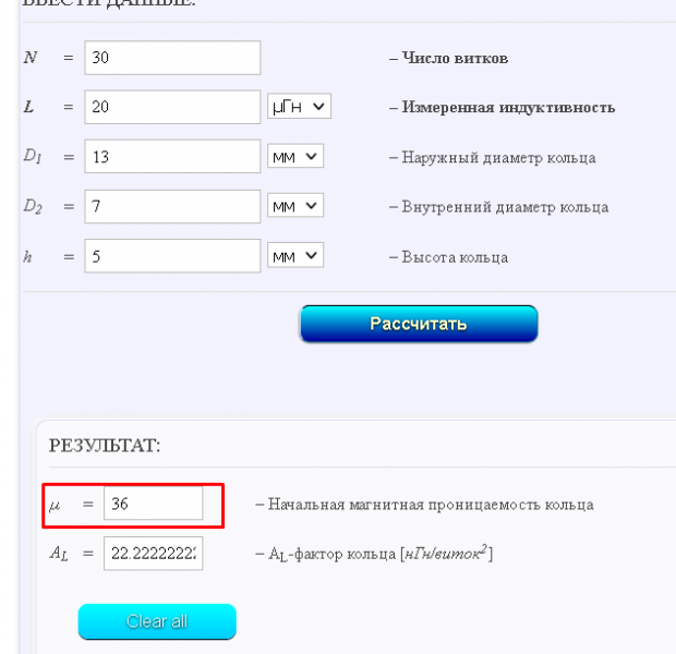 Добавлено after 2 hours 19 minutes 58 seconds: Попробовал мотать на кольцах от энергосберегаек. Но получается бешеная индуктивность - на 6 витках уже 110 микрогенри. Вбил в программу - там десятки тысяч проницаемость получается.