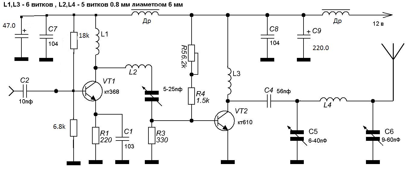 Мощность решил сделать порядка 200 – 300 мвт. На выход конечно лучше бы поставить КТ610, но я решил поставить два транзистора КТ316Б в параллель. В принципе можно и КТ368 или еще какие с Fт не менее 800 мгц. Их сейчас навалом. Схема стандартная. Придумать, что либо новое трудно, да и смысла нет для моих целей. Питание выбрал 6 вольт.
