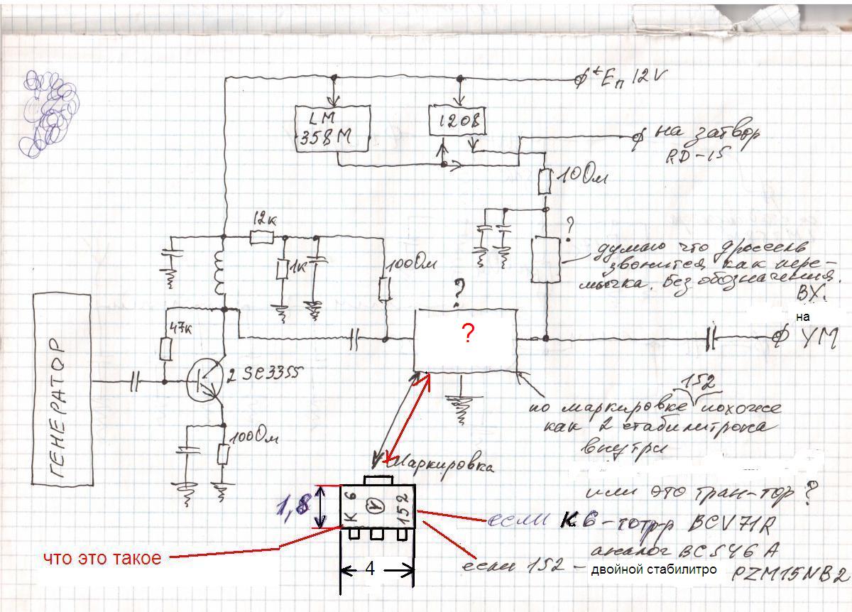 Николай_С Пробовал не лепится!!!Пробую еще раз!!!! СПАСИБО.ВЕК ЖИВИ , УЧИСЬ, И ДУРАКОМ ПОМРЕШЬ!!!!!Короче нужно знать каую кнопку нажиматьи в какой последовательности.Вот на Вых. РД-15 и горит...Ток смещения на затворе задается и составляет 500Ма по даташиту.Но меня интересует схемка которую я выложил на стр№16, сообщение так и не увидел под номером какое????Отправлено 26.01.2014года. Но причина мне кажется в задающем генераторе.Или идет перекачка РД-15го или со стабилизацией напряжения что-то не то...Короче буду копать....Если подскажете что находится в квадрате под вопросом ... буду очень благодарен..Думаю диод Шотки...или ВЧ транзистор.Склоняюсь что ВЧ транзистор судя по построению схемки...Чтоб не флудить на форуме пишите в личку, отвечу и дам адрес свой эл. почты...В долгу не останусь.С уважением. Было изображение и куда оно пропало???