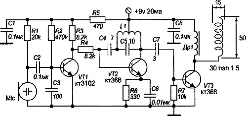 Третий жук. В нем тоже добивались большой мощности при низком питании, но не обращали внимание на стабильность. Для этого применили в качестве задающего индуктивную трехточку. Модуляция делается с помощбю варикапа. В качестве варикапа взял кремниевый диод КД102. Если девиации маленькая, то можно поставить два таких диода параллельно. Мне хватило одного. С двумя получалась перемодуляция и соответственно искажения при громком разговоре. Мощность зависит от резистора R6. Я его совсем замкнул. Напряжение на выходе при измерении пробником получилось 6 вольт, т.е. этот жук еще мощнее. Правда это в ущерб стабильности. Резистор R10 я не ставил, т.к. выходной каскад и так нормально раскачался.
