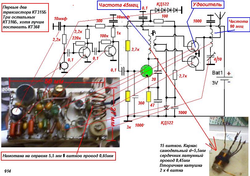 конденсатор С4 10-100пФ подбирать и смотреть на какой частоте заведется. Как мне посмотреть? могу только на фм радио тишину слухать, есть осцил н313 до 1мГц. Хотя нормальным осциллом его назвать сложно -сто лет в обед и о точности каких -то показаний на экране можно забыть(высчитать частоту на экране по длине колебания), так только посмотреть есть или нет... ГКЧ могу собрать но с настройкой будут проблемы... Есть индикатор поля. Далее есть фильтр пьезокерамический видимо на 465кГц, транзисторы кт325в,316д,920в, 315, 361г, могу быстро купить КТ601А, КТ602ам, КТ603Г, КТ603Е, КТ604АМ, КТ604Б, КТ604БМ, КТ605АМ, КТ605БМ, КТ611БМ, кт907аб,908б,909абг,922гд Могу в течение недели купить кт368ам и микросхему mc3361. Есть катушки с сердечниками из феррита вроде, высота 10мм диаметр 5мм. Ну и конечно желание собрать ЧМ р\станцию с параметрами приемника не хуже 0,5мкВ и мощностью передатчика 200-250мВт , а потом умощнить его до 2-4 ватт. На примете было 3 схемы: Колибри, Простая, карманная, для села - Радиолюбитель 8\93, и уоки-токи без секретов на 10стр ветки. Схемы приемника и передатчика могут быть из разных схем разных авторов, есть еще куча других ... Какую сделать мне, чтоб вы могли мне помочь ее настроить? Желательно чтоб на моих деталях.