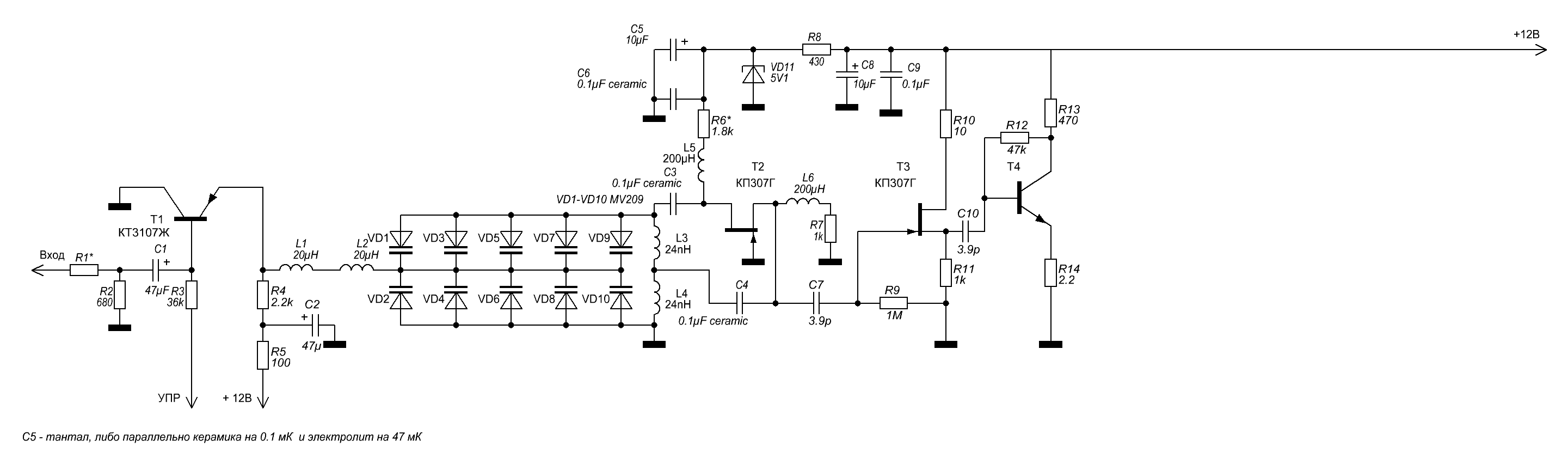-У кп305 все зависит от буквы -рабочая точка напряжение нужно подавать с делителя на затвор небольшой + и с истока снимать на логический элемент тож с части резистора. а так разница только в шумах гетеродина. Все эти шумы к конечном итоге попадают в смеситель поэтому чем меньше шум у транзистора тем лучьше. По поводу варикапов: нужно следить за напряжением на контуре генератора чтобы оно не открывало варикап. По этому всегда стремились питать генератор меньшим напряжением от крена и соответственно потом усиливать напряжение генератора до требуемого значения. Cмеситель, если он не ключевой требует точное значение напряжения -больше хуже и меньше тож хуже, от этого зависит коэфициент преобразования и чутье приемника. А напряжение на варикап по этому и брали от отдельного источника 30в.