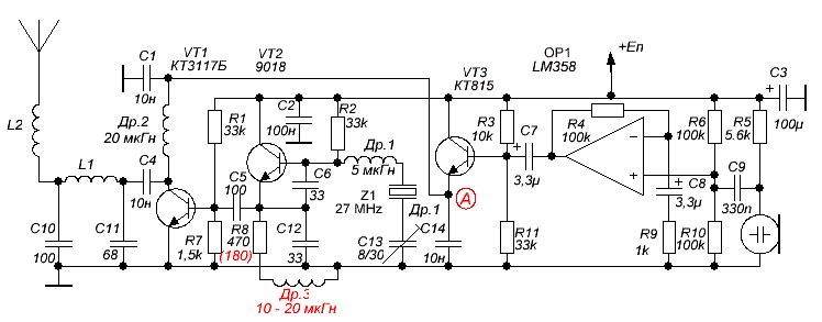 Красным нарисовал то, что потребуется для измерения параметров схемы. В точке «А» должно быть напряжение порядка 5 вольт. В принципе добиться этого можно и без стабилитрона. У нас получилось, что передатчик нагружен на резистор 51 Ом и мы измеряем напряжение на нем. Крутим L1 и добиваемся максимума показаний. Без дросселя Др.1 желательно добиться порядка 3 вольта. Это значит мощность будет где то порядка 100 мВт. С дросселем Др.3 и резистором R8 величиной 180 Ом у меня получилось 4,5 вольта, что соответсткует мощности больше 200 мВт, но транзистор VT1 греется и держать передатчик включенным больше одной минуты не нужно. Можно поставить более мощный транзистор. Например КТ603 с буквами Б, Г, Е . Можно также поставить два КТ3117Б в параллель.
