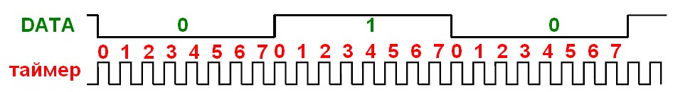 -Для синхронизации мы проверяем состояние вывода МК через каждый "тик" таймера. -Для записи бит мы проверяем состояние вывода МК через каждые 8 "тиков" таймера (но можно и через каждый "тик" таймера).