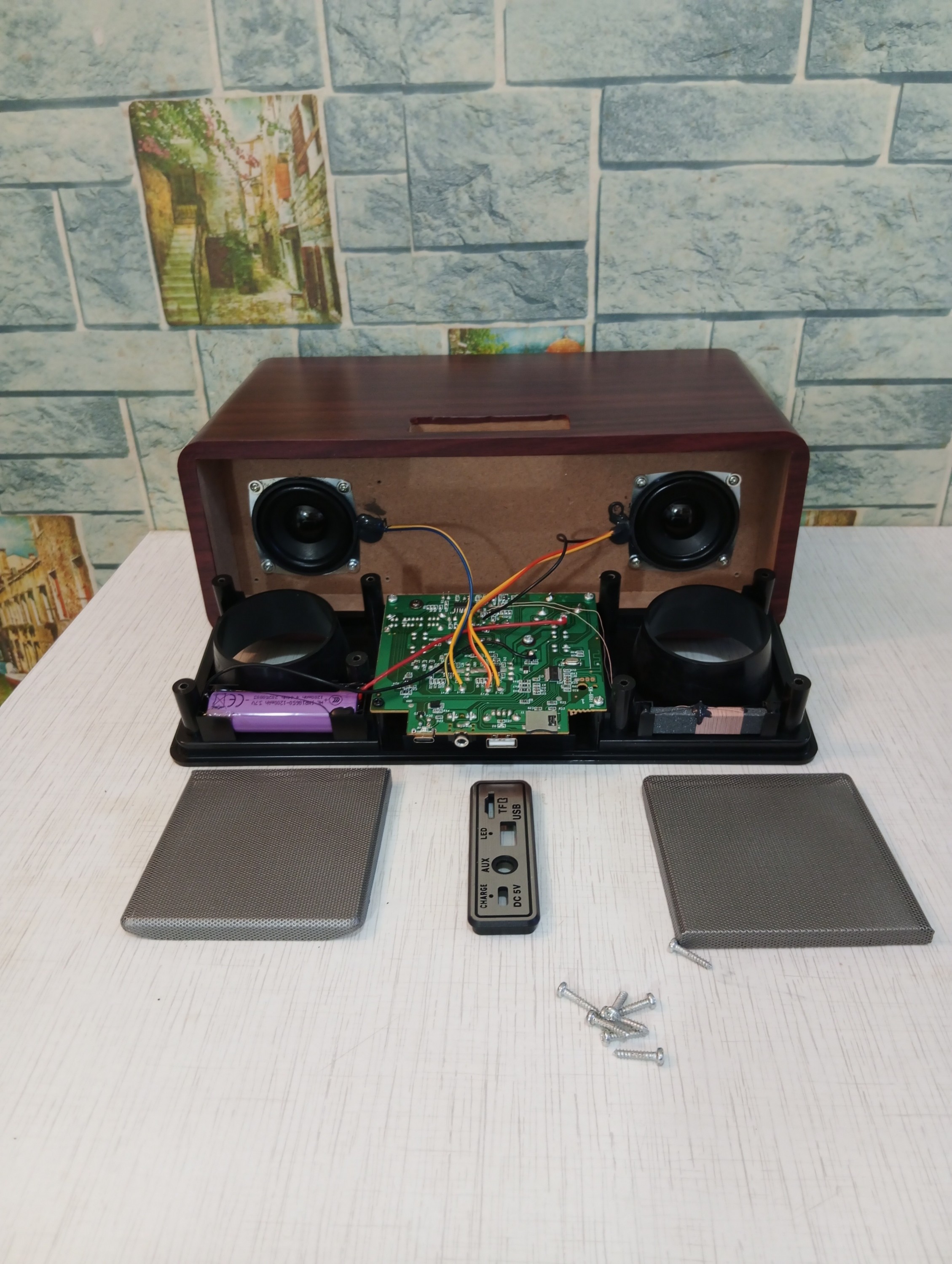 Приёмник монофонический, не смотря на два динамика и стереофонический УНЧ, собранный на 2х микросхемах SL 5316, входа УНЧ сведены в моно.Динамики стоят диаметром примерно 56 мм, АС однополосная, тип АС фазоинвертор, корпус АС полностью деревянный, точнее материал типа ДВП, лицевая панель пластиковая.