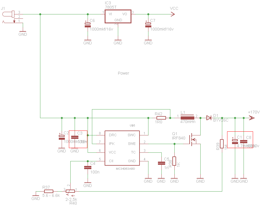 Если поставить IRF4905, как по схеме, резистор R1 и катушка начнут испускать волшебный дым . Даже если заменить полевик на подходящий (IRF840, IRF740) КПД с резистором R5 1К будет низким, а транзистор сильно нагреется. Правильнее будет схема с биполярным транзистором в цепи затвора полевого. С диодом BAS15 тоже проблема, при напряжении более 50В, он превращается в резистор. Этот диод специально предназначен для борьбы с импульсами ЭДС самоиндукции, ради которых и делаются повышающие преобразователи. На плате неадекватно маленькое место под дроссель. Его придётся на проводках вывешивать. При наличии конденсатора в ОС, топология разводки не особо влияет на работу, размещение деталей и длина связей не особо принципиальны, на макетках, я ставлю детали на свободное место, не напарываясь на проблемы связанные с топологией.