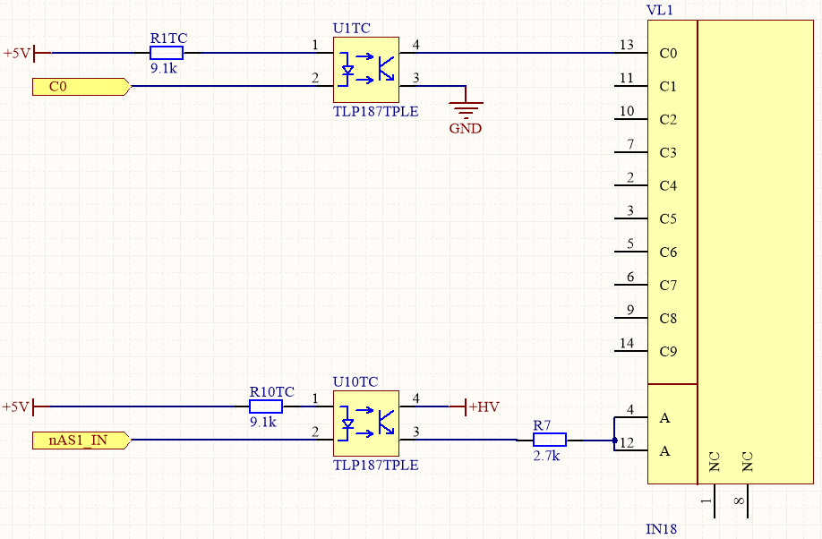 Столкнулся с проблемой при использовании оптопар TLP187 (схема приложена). Всего 6 разрядов, частота каждой лампы 50Гц (300Гц частота таймера для обработки всех 6 разрядов). Собственно проблема - засветка на соседние разряды. Думал что возможно будет от нее избавиться путем увеличения значения резистора на входе: т.к высокий коэффицент передачи по току не нужен то можно уменьшить ток на диоде и поидее выходной транзистор не будет работать в насыщении (и следовательно будет закрываться быстрее). По-этому на схеме установлены резисторы 9.1кОм. Однако к сожалению это не помогло. Также не помогла задержка в 300-2000мкс меджу включением соседних разрядов. Видно отчетливое мерцание ламп, однако соседние разряды все равно засвечены. Все осложняется отсутствием в данный момент рабочего осциллографа, отлаживаю схему как слепой. По ощущениям проблема в катодных оптопарах. Может ли помочь добавление резистора (скажем 200кОм) между анодом и землей? Поидее при закрытии транзистора это должно помочь рассасыванию носителей в базе и соответственно должен закрываться быстрее. Видел что люди сталкивались с подобной проблемой с оптопарами но к сожалению нигде не нашел решения проблемы. Если у кого-то есть опыт, поделитесь пожалуйста.