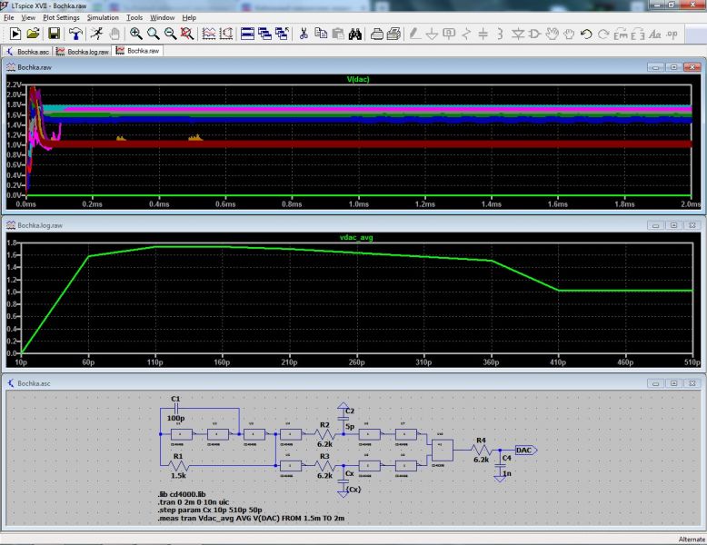 В диапазоне от единиц пикофарад, до 500 пФ. Что собственно легко достижимо, при использовании другого схемотехнического решения. Чтобы не быть голословным, для любителей конкретных "цифр" и значений. Приложу портянки симулятора. А это Ваша (на самом деле нет), схема. И насколько она не линейна. Конденсаторы RC-фильтра занизил, для ускорения счета... Дальнейшее обсуждение, считаю не целесообразным, для себя я выводы сделал. Всем принявшим участие в обсуждении, спасибо!
