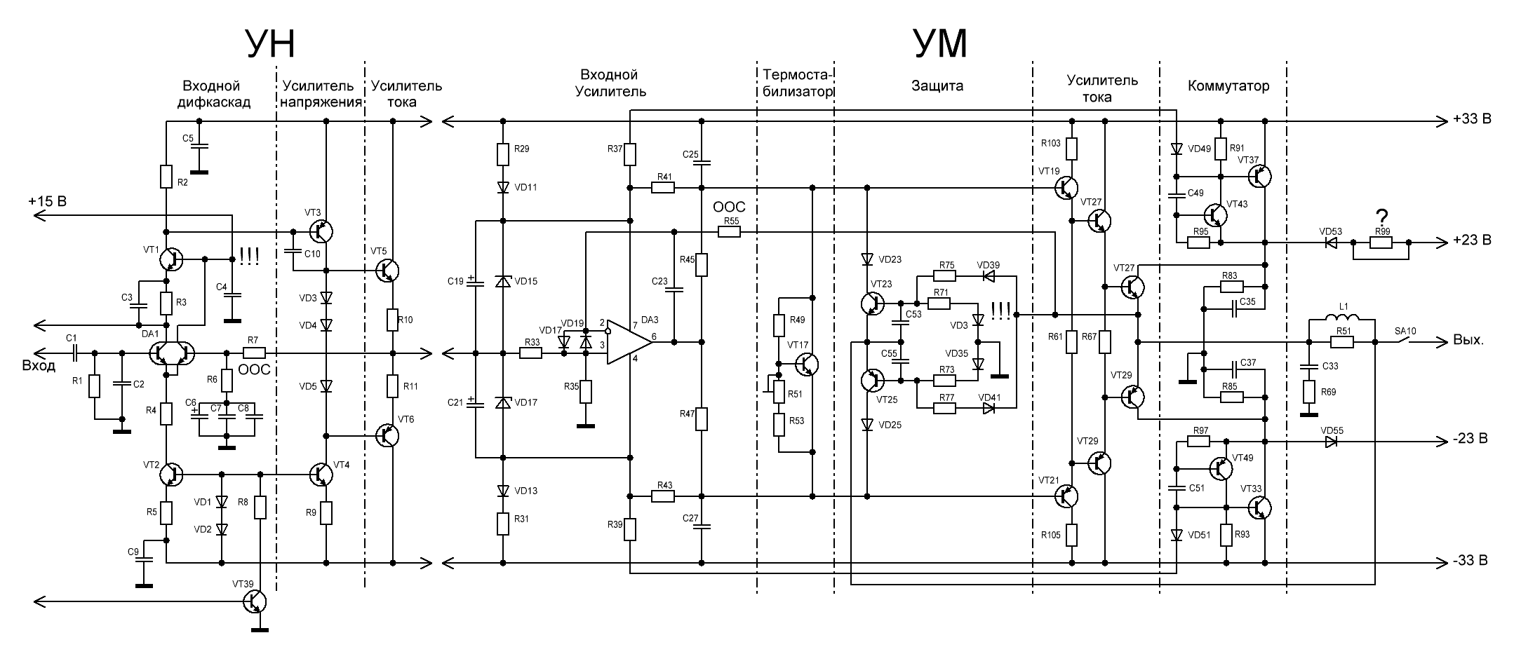 На своем варианте я выделил вертикальными линиями более-менее "самостоятельные" узлы. Как видите, за исключением входного каскада на ОУ DA3 усилителя мощности (УМ) и наличия каскада коммутаторов (VT33VT37VT43VT49), она не сильно отличается от приведенной в статье. Даже больше: (пред)Усилитель напряжения (УН) представляет собой совершенно самостоятельный маломощный УМЗЧ мощностью порядка нескольких ватт, который можно вынуть и использовать самостоятельно, только уменьшив номиналы эмиттерных резисторов R10 и R11. Со своей локальной ООС (резистор R7). Его покаскадная схемотехника практически повторяет приведенную в статье. Разве что в нагрузке дифкаскада стоИт не токовое зеркало, а каскод на транзисторе VT1 (поскольку сдвоенный транзистор DA1 слишком низковольтен), а нагрузкой является просто резистор R2.