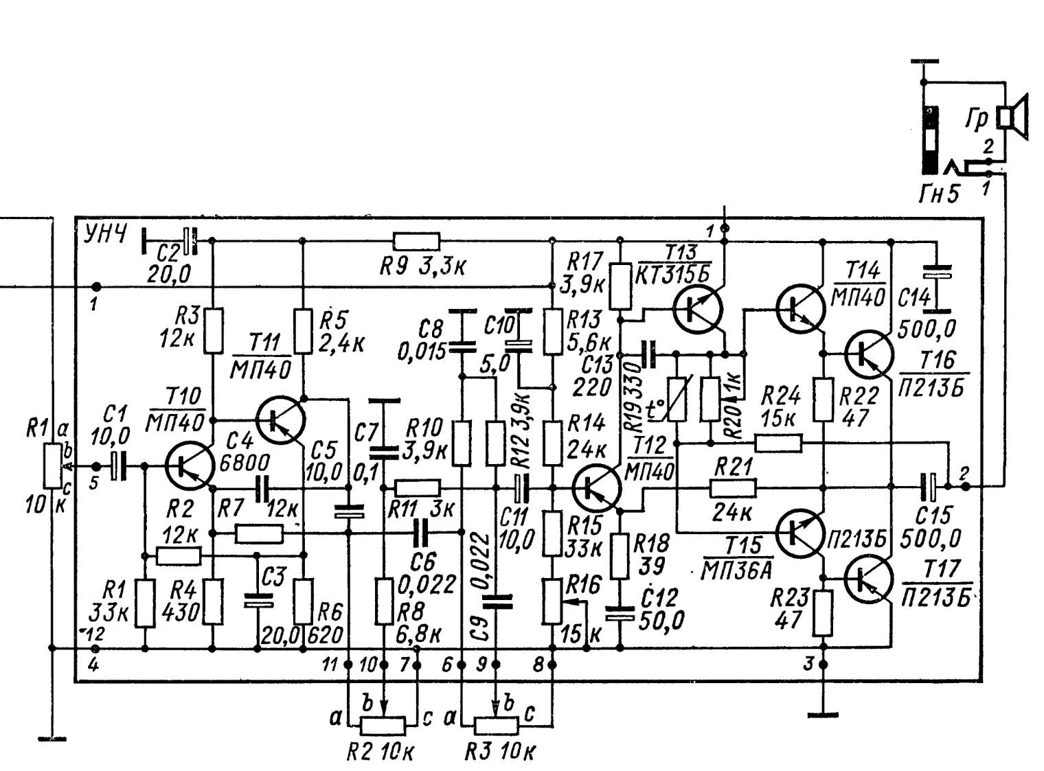 Как там резистор термокомпенсации R19 поживает? Проверте прибором с транзистортестером типа ТЛ4М: токи утечки, или подкинте заведомо исправные Т12, Т14, Т15, у какого либо от времени кристал мог деградировать. Если их нет в запасе, то поменяйте Т10 и Т11 местами с Т12 и Т14. Если не поможет, так-же проверте прибором с транзистортестером типа ТЛ-4М на утечку, или замените на заведомоисправные выходные Т16, Т17.