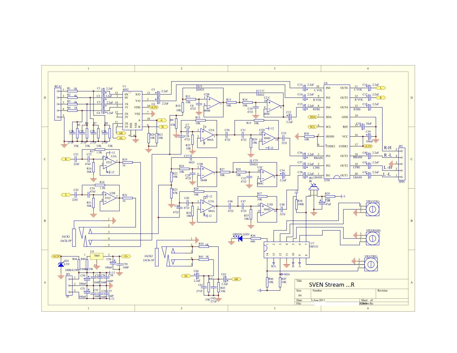 Здравствуйте, уважаемые Радиокоты. Достались мне по наследству Колонки 2.0 SVEN STREAM Mega, которые после неисправности (не играла одна из колонок) пытались починить. Судя по следам флюса который я отмыл менялись переменные резисторы для регулировки громкости/ВЧ/НЧ, а также менялись гнезда подключения тюльпанов.