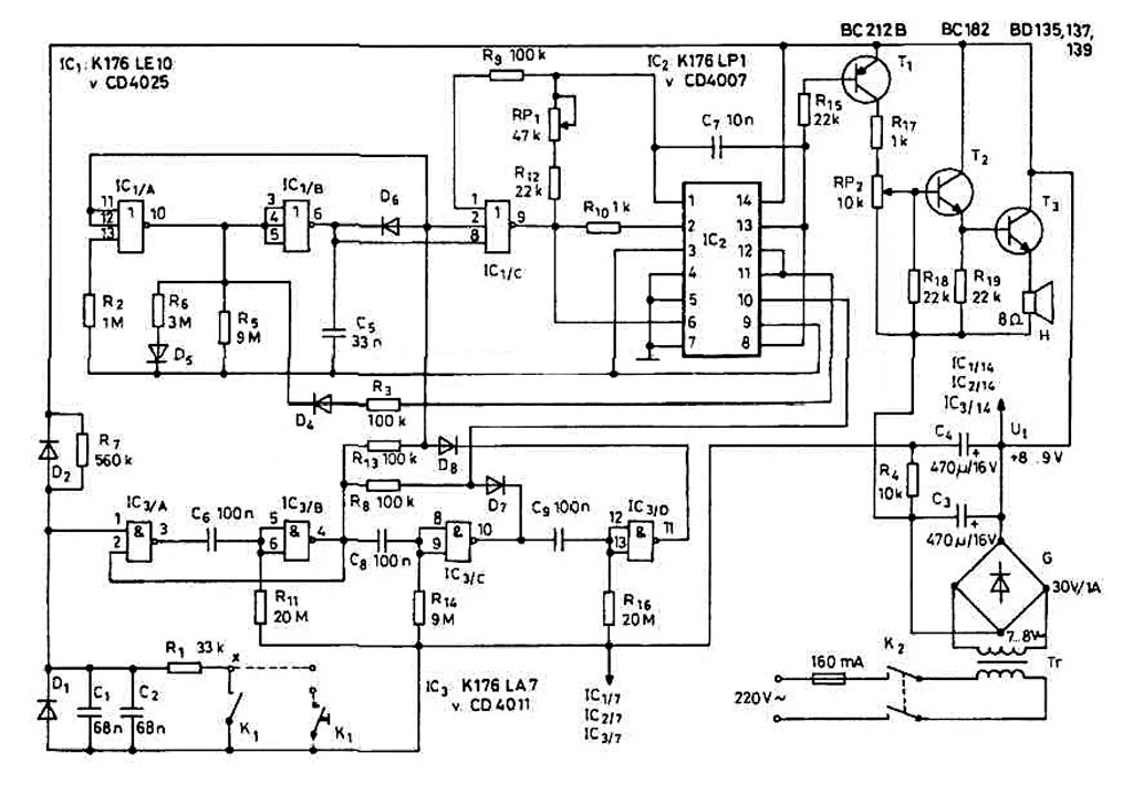 Здравствуйте глубокоуважаемые радиокоты! Недавно попал ко мне Советский электронный дверной звонок. Решил отремонтировать его ради спортивного интереса и не смог Там в основе три микросхемы, задающие звучание соловья. В общем, он как-то работает, но это звук не звонкого соловья, а скорее полудохлого крякающего гуся Я максимально все проверил и прозвонил - все исправно, включая емкости конденсаторов; кроме этих микросхем- их я даже и не знаю как проверить. Все очень запутанно для меня. Помогите пожалуйста разобраться, какая из микросхем неисправна. Частота "крякания" сейчас в районе 100-200 Гц, а должна, по моим примерным соображениям, плавно меняться в диапазоне до 1 кГц примерно... Что именно здесь задает такую частоту, я так и не смог разобраться. Схему прилагаю.