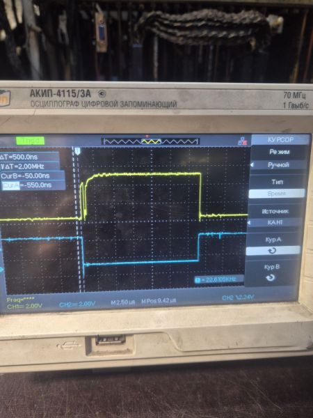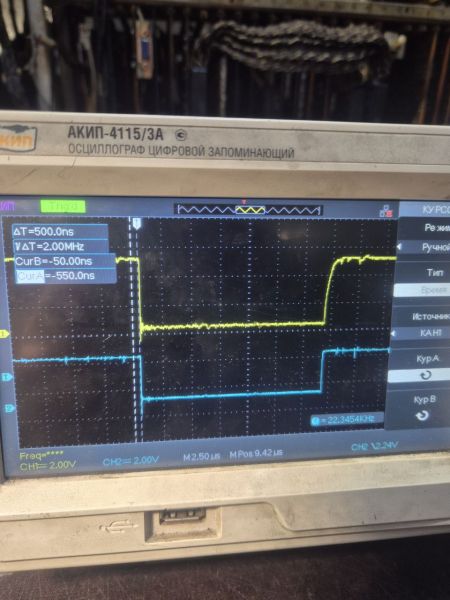 Плата процессора мс1201. На входе импульс ровный, а на выходе появляется некая просадка. На схеме элемент выделен розовым. Это к155лн1. С входа сигнал идёт на входы 2х триггеров к155тм2 и RC цепь за которой И к155ла4. Если поднять резистор то эта просадка исчезает. Я так понимаю в один момент конденсатор пропускает высокий ток и это вызывает эту просадку? Потом он заряжается и все становится хорошо. Конденсатор менял (180пФ), резистор нужного сопротивления (56Ом). Так же дабы исключить внутренние глитчи поменял логику (И и ИЛИ) но все тщетно. 50 проводник куда идёт я не нашел (возможно никуда). На другой аналогичной исправной плате такого провала нету.
