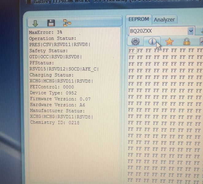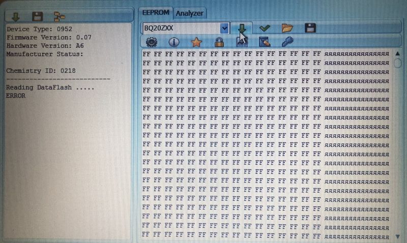 Можно к врачу, можно и в сервис, смотря к кому вы ближе. У вас даже отчета не видно - кнопка Info выдает не его, а флаги. Отчет - Зеленая Стрелка Вниз (на левой панели). Трудно вообще что-то сказать без отчета. И неплохо бы его тек стом, а не скриншотом. Трудно читать с дохлой картинки, да еще повернутой на 90". Если ваш чип bq20z95dbt, как вы писали ранее, то возможно он кастомный (сами z95 - общего пользования, а вот dbt... не знаю). Видимо прошивка не поддерживается этим софтом (этой версией). Пробуйте другим. Может еще кто чего подскажет...