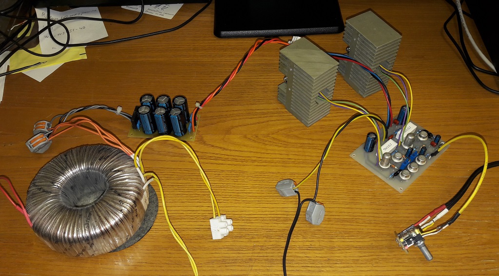 Усилитель С. Филина. Приспособил основательный источник питания. Уменьшил сопротивление резистора, задающего ток стабилитрона, в цепи питания входного каскада (теперь стабильно 12,4 вольт). Установил ток покоя выходного каскада 50 mA (в статье автора не точного указания). Звучит как вполне современный транзисторный усилитель. Раздаёт изрядную мощность. Не греется. С ростом громкости, звук не переходит в разряд раздражающих.