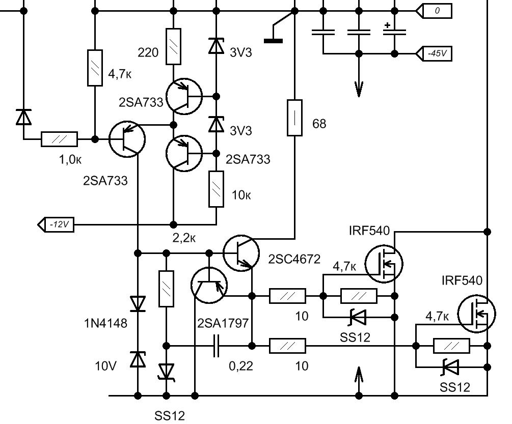 В моей же схеме резисторы 4.7 кОм у затворов и диоды - это скорее страховка, нежели необходимость (т.к. в схеме нет критичных к данному явлению мест, а самим транзисторам отрицательный выброс совершенно безвреден. Единственное место, которое чувствет его - это транзистор, который коллектором на 68 Ом соединён - он пытается самостоятельно купировать выброс, если конечно нет диода). Точно также и 10 Ом - при таком построении они не нужны т.к. ток затвора и так чётко ограничен другими элементами. Разве что антизвонная роль, но это опять же по-месту решается...