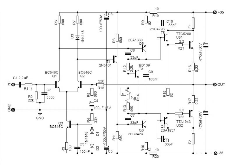 Ток от этого сопротивления будет зависеть, т.к. от него зависит ток через диоды. Но уменьшать его я бы не ркомендовал, т.к. его уменьшением уменьшается и ток через нижний транзистор на пиках сигнала. Ток покоя был рассчитан на сопротивление в эмиттерах выходных транзисторов 0.47 Ом. Поскольку сопротивления установленя 0.3 Ом, ток покоя пропорционально вырос - примерно в полтора раза. Уменьшить ток покоя можно (а зачем, вообще? Если питание сетевое - пусть оно так и остаётся), установив между базами выходных транзисторов, параллельно диодам, сопротивления, величину которого нужно подобрать в зависимости от желаемого тока покоя. Но температурная стабильность немного ухудшится. Попробуйте 120-150-180-220 Ом