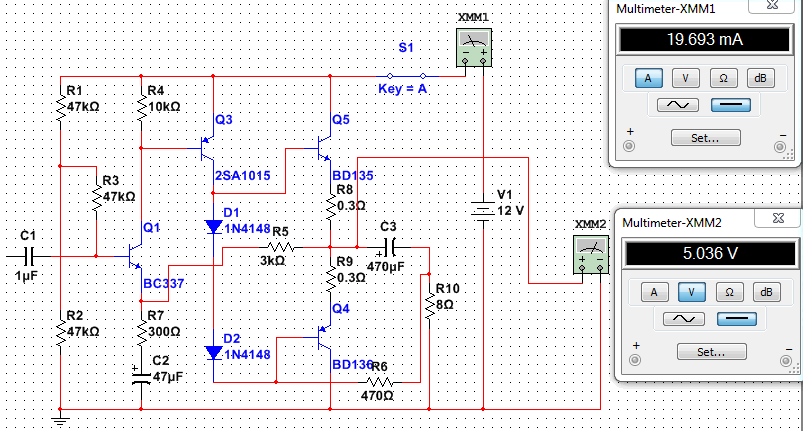 Ну, что же, собрал УНЧ, проверил, "фунциклирует". Ток покоя 35 мА, в средней точке выходного каскада 4,5 вольта относительно минуса. У выходных транзисторов (КТ814,КТ815) h21Э около 140 +/- 5 (у КТ3102 и КТ3107 не удосужился померить), эмиттер-база 0,64 вольта, при Uпит. 12В. Да, резисторы в эмиттерах самодельные, проволочные, примерно 0,3 Ома. Намотаны проводом ПЭВ-0,12. Если ткнуть пальцем на вход, ток до 100 мА. После получаса во включенном состоянии без входного сигнала слегка греются (по-разному) радиаторы (8,5 см2) выходных транзисторов. Собрал схему в Мультисим 12, http://img.radiokot.ru/files/87611/1in20fql8e.gif во вложении. Поизгалялся вдоволь, но так и не получилось сделать 6 вольт на +С3. Какие будут советы? Как знак благодарности предлагаю пользователям Sprint-Layout 6 несколько своих макросов, возможно кому понравятся. Мне не нравилось паять выводы деталей на полигонах, поэтому сделал специально для этого несколько контактов. Паять приятнее. Признаюсь, что подсмотрел это на заводских платах. Но на любительских не видел ни разу. Всем спасибо!