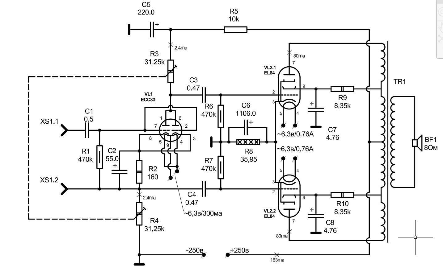 R-Catherine, звук у вас "хороший и глубокий" как раз именно потому, что в качестве выходника ТВЗ-1-9-SE-Light, которыми ТЭК торгует ныне по 2400, что еще очень по-божески. У них трансы реально неплохие, а которые на М6- вообще отличные. Плюс ультралинейное включение- то есть локальная обратная связь. Остальную схему можно уже не рисовать. Но если нарисовали- напрасно не показали регулятор громкости, если таковой там есть. Бо на раскачке триод, значит относительно большие межэлектродные емкости, значит автоматом эффект Миллера. Значит- ощутимый завал по ВЧ на малой и средней громкости. Итого: "чем меньше- тем лучше", не более 10-20 кОм. А если усилок работает сразу от звуковухи- тогда вопросов нет. И вот вопрос: на кой вы лепите в катод и сетку входного триода резюки аж по 1 ватту? Там 0.125 больше чем отбавляй. В сетку пентода лучше 470 кОм- бо по паспорту при автосмещении "не более 0.5 МОм", мощность его у вас тоже сильно избыточна. Это вот "что в глаза бросилось"...