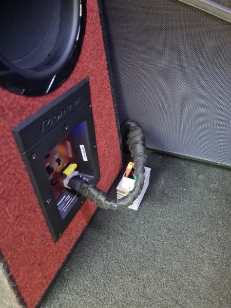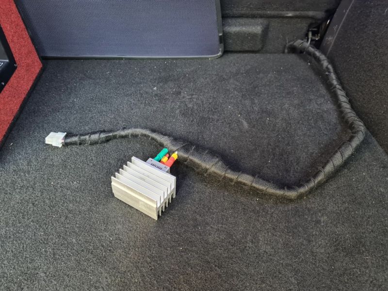 Да, можно было бы придумать иное место для интеграции этого диода с радиатором, где-то под кузовом, может вообще в подкапотном пространстве, но у меня как раз в этом месте (на фото) был разрыв в цепи (место соединения питающего провода со штатной колодкой саба), поэтому пошёл по пути наименьших трудозатрат.