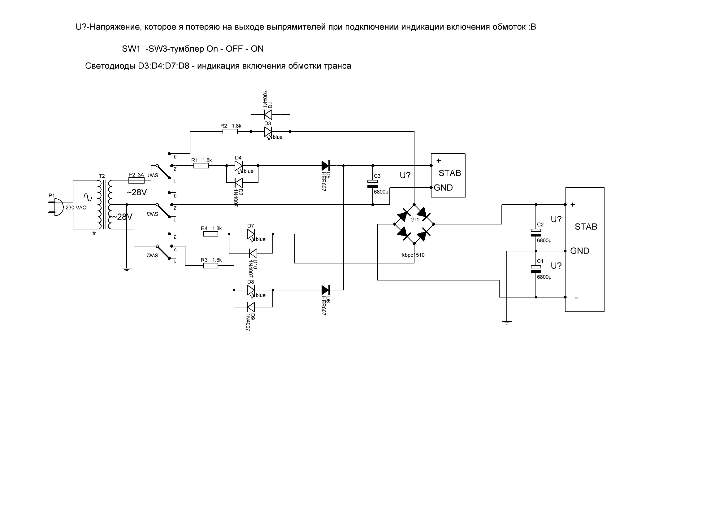 Вот схему включения набросал ,как хочу индикацию сделать .Интересуют следующие вопросы 1 .правильно ли я нарисовал схему включения :2.Сколько я потеряю напряжения при включении индикации работы обмоток :3.в монм первом сообщении расчет правильный или нет номинала и мощности резистора для светодиода .или как по другому пощитать его .или схему перерисовать по другому включения ??Жду ваших ответов и предложений безгранично благодарен за ранее .просьба сильно ногами не пинать если что неправильно .