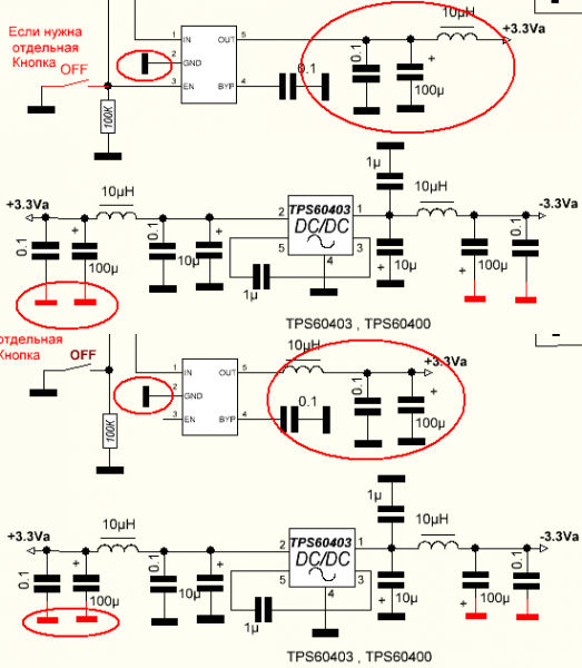 И вверху и внизу возникает вопрос: на какую землю нужно подключить выделенные элементы? Ведь нам нужны стабильные +3.3Va относительно аналоговой земли, а не цифровой. Понятно что электролитический конденсатор 100 мкФ и последующие LC-фильтры сгладят помехи, но эффективнее было бы не пропустить их средствами LDO-стабилизаторов.