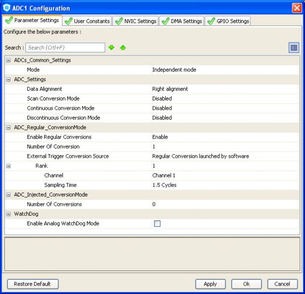 Скачал CubeMX v4.23. Решил поиграться с АЦП. На вкладке "Pinout" выбрал нужные мне каналы. На вкладке "Configuration" смотрю параметры ADC1.